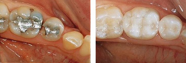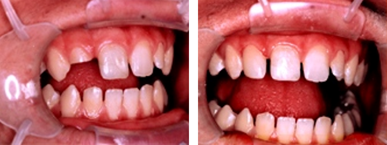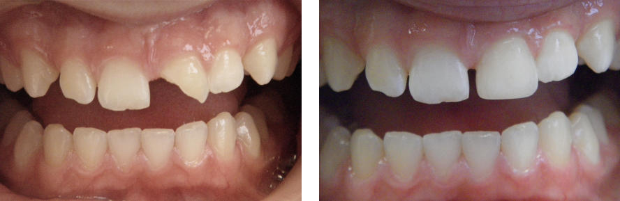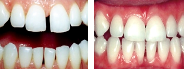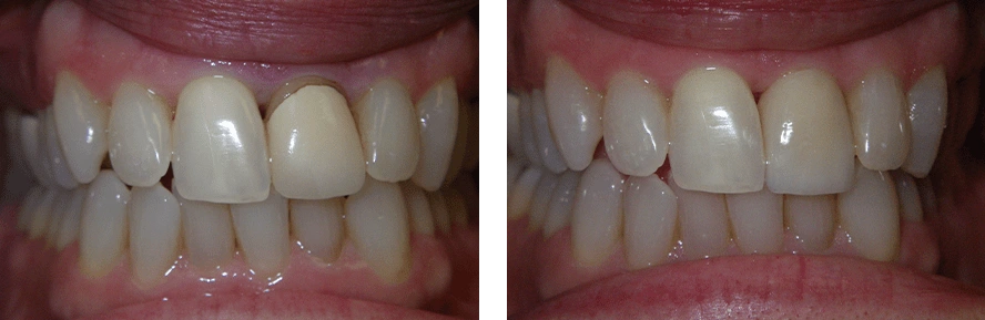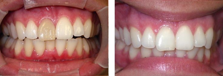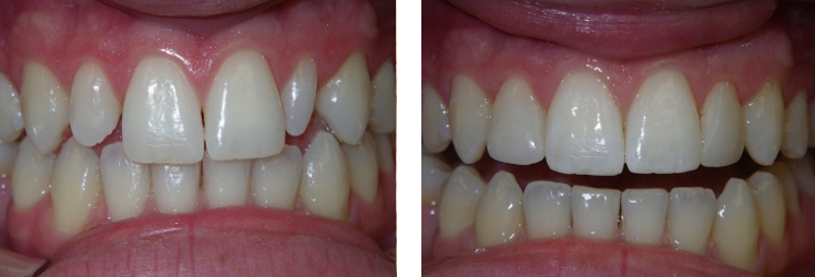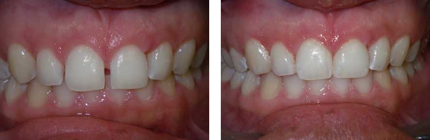Patient came into the office requesting crowns for her front teeth. She was told (by another dentist) that she would also need root canal treatment. Upon speaking with her, I discovered that she was unhappy with the space between her two front teeth. Suggested that we try bonding first. She agreed. Here are the results. No anesthesia was needed, and this procedure is completely reversible if she ever wants her space back. No root canal treatment was needed!