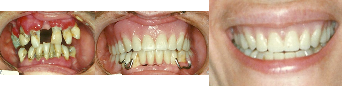 Patient was unhappy with her smile. She wanted a bigger, bolder, brighter smile. She was missing some back teeth and wanted to fill in her spaces to allow her to eat better. Her treatment was more complex, as it required that I totally alter the way her front and back teeth met. Patient had a total of 12 porcelain laminates (six on top and six on the bottom) and four cemented porcelain bridges that filled the spaces caused by her missing teeth. Her smile is beautiful, and she loves the improvement in her ability to eat.